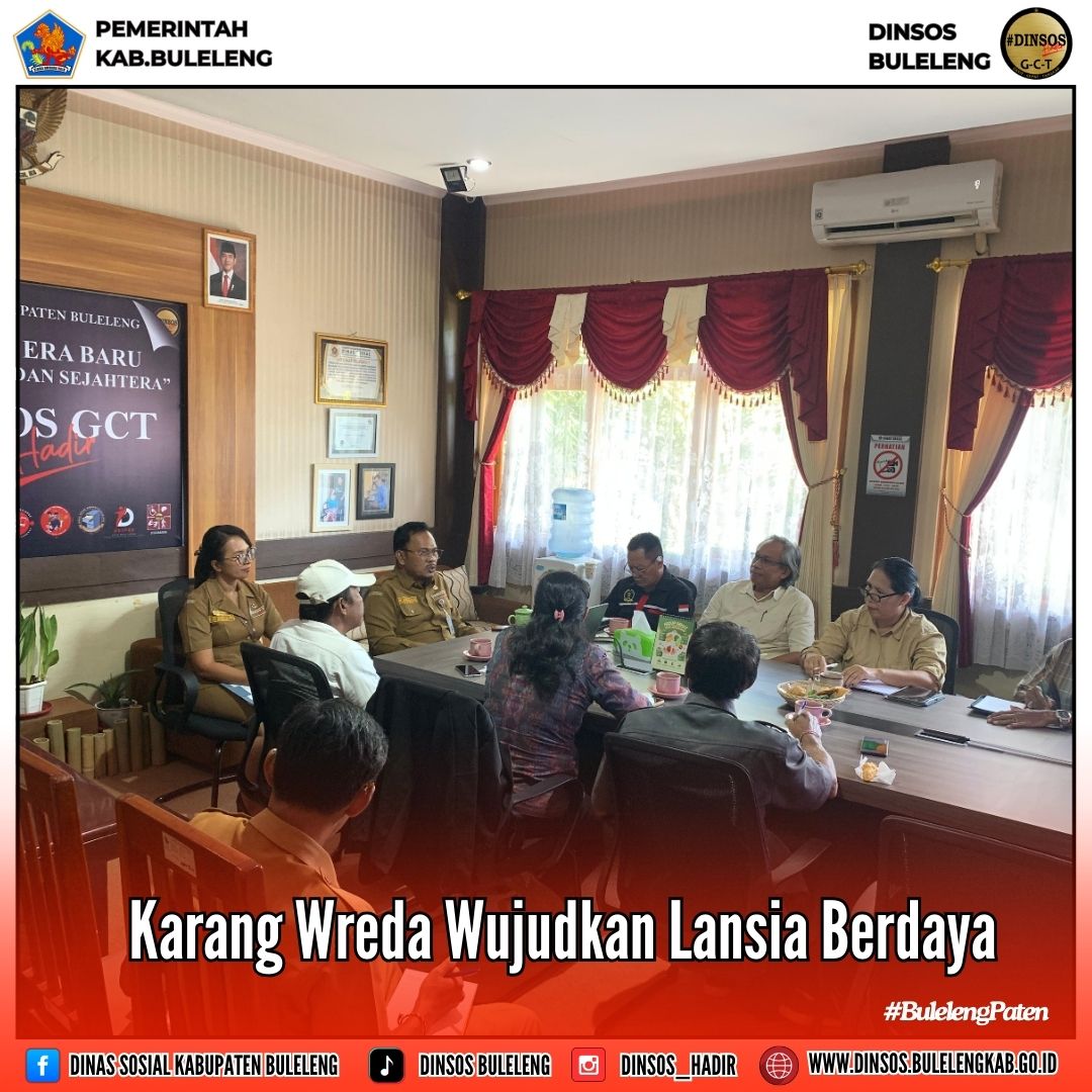 Dalam upaya meningkatkan kesejahteraan dan pemberdayaan sosial bagi para lansia, Dinas Sosial Kabupaten Buleleng melaksanakan Sosialisasi Pembentukan Karang Wreda bersama para Ketua Forkom BPD (Badan Permusyawaratan Desa) sebagai lembaga yang mewakili masyarakat desa dalam penyelenggaraan Pemerintahan Desa di wilayah Kecamatan se-Kabupaten Buleleng pada Senin (19/5/2025) di Ruang Kerja Kepala Dinas Sosial.