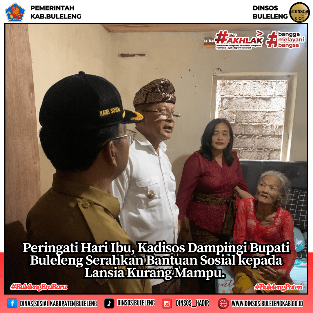 Bertepatan dengan Peringatan Hari Ibu, Bupati Buleleng I Nyoman Sutjidra didampingi Kepala Dinas Sosial Kabupaten Buleleng I Putu Kariaman Putra, S.Sos., M.M., serta Camat Buleleng I Putu Gopi Suparnaca, S.Sos., dan Lurah Liligundi I Gede Armada melaksanakan kunjungan dengan menyerahkan bantuan sosial kepada warga lanjut usia kurang mampu di Kelurahan Liligundi, Kecamatan Buleleng.