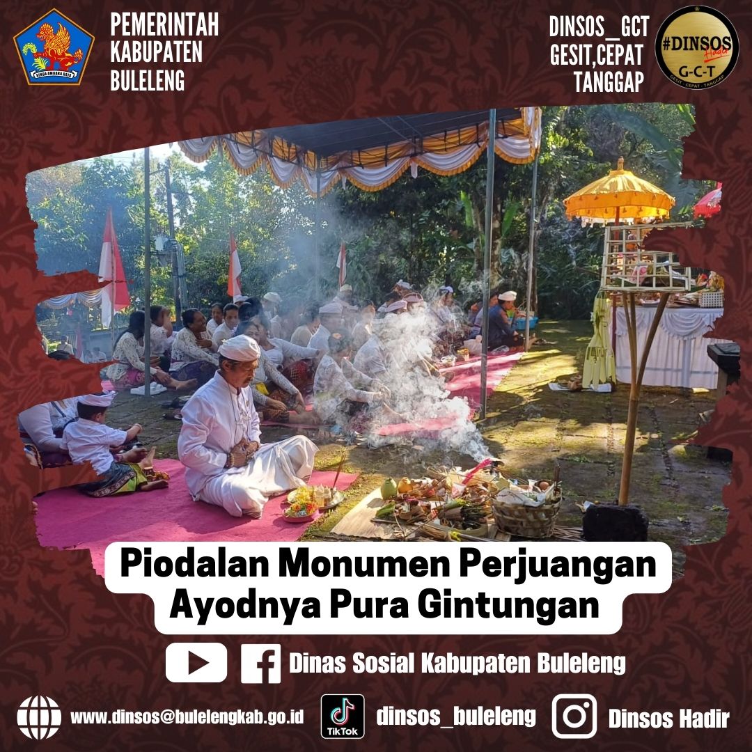 Pelaksanaan upacara persembahyangan bersama piodalan di Pura Monumen Ayodya Pura Gintungan, yang diadakan oleh Dinas Sosial Kabupaten Buleleng pada 5 Mei 2025.