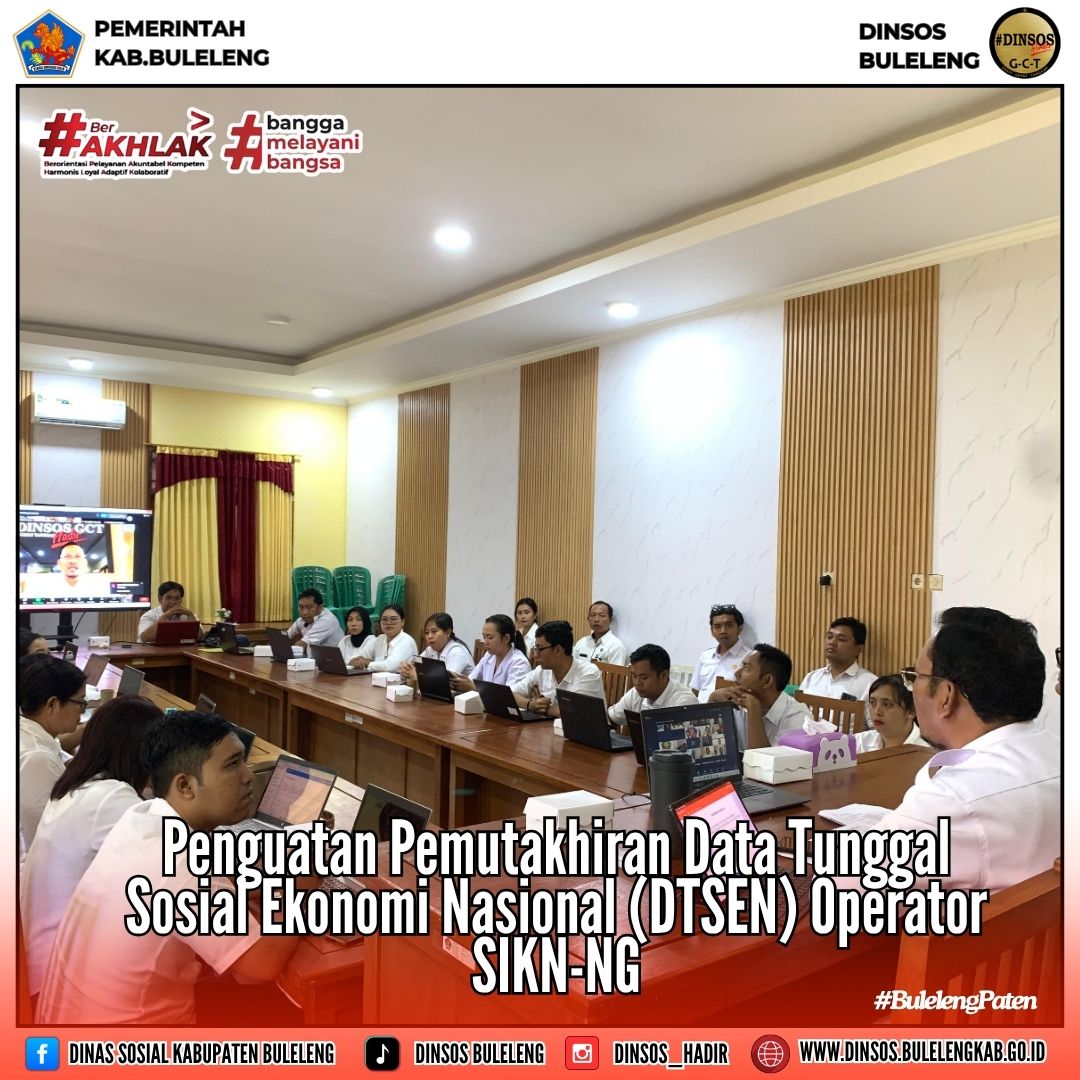 Pemerintah Kabupaten Buleleng melalui Dinas Sosial Kabupaten Buleleng menyelenggarakan kegiatan Penguatan Pemutakhiran Data Tunggal Sosial Ekonomi Nasional (DTSEN) yang diikuti oleh para operator desa dan kelurahan se-Kabupaten Buleleng. Kegiatan kali ini dilakukan secara luring dan daring ( zoom) oleh para operator desa/kelurahan. Kegiatan ini bertujuan untuk meningkatkan kapasitas aparatur desa dalam melakukan verifikasi, validasi, dan pembaruan data sosial ekonomi masyarakat di wilayahnya masing-masing.