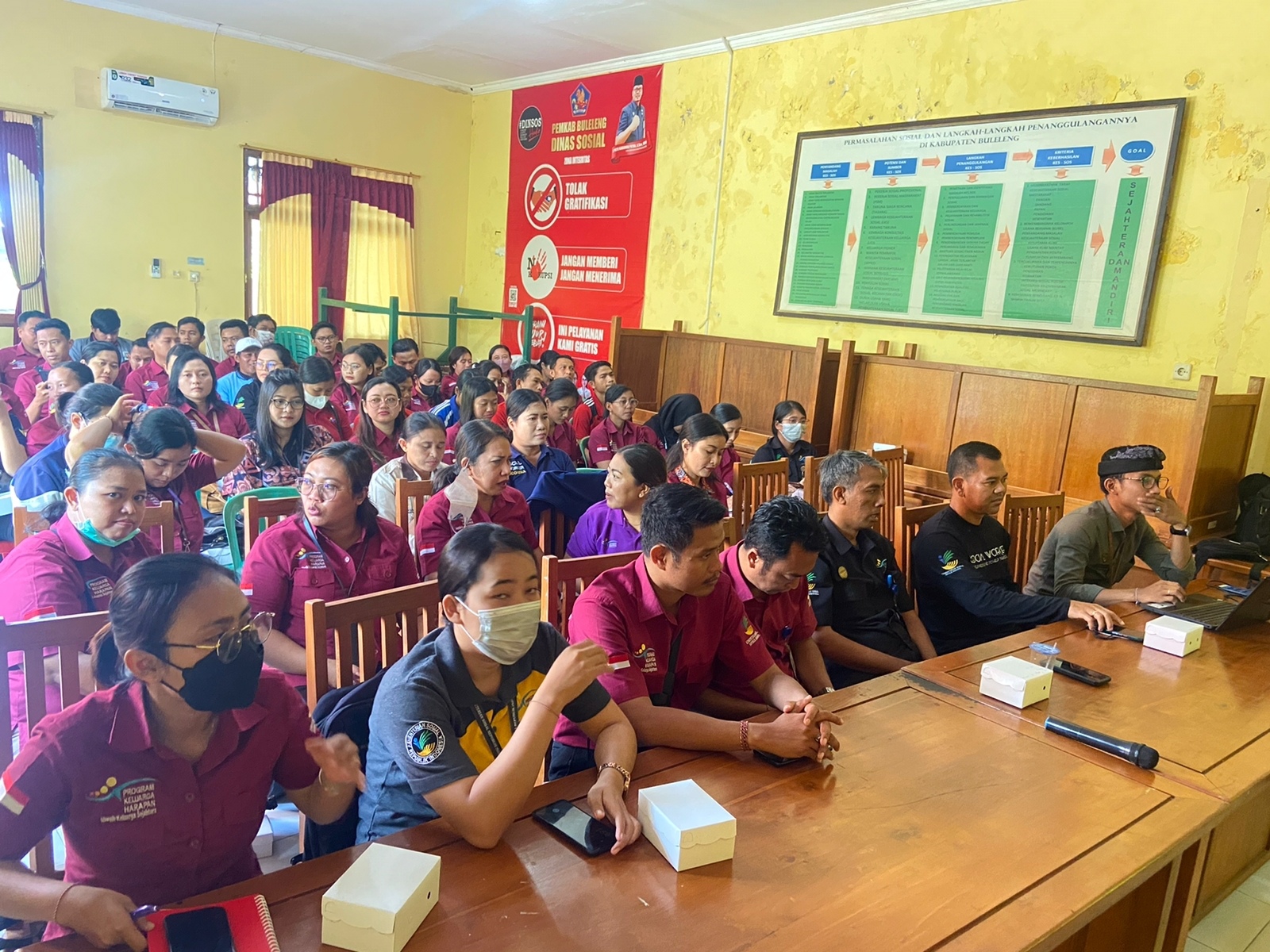 Bertempat di ruang rapat Dinas Sosial Kabupaten Buleleng, dilaksanakannya rapat dalam meningkatkan kualitas data pada DTKS terkait Proses Usulan, Verifikasi Kelayakan, dan Pemuktahiran Data yang dimana hal tersebut menindaklanjuti surat No : 73/10/D1.02.1/2023 dari Kemensos RI melalui Pusat Data dan Informasi Kesejahteraan Sosial / PUSDATIN. Sebanyak 82 sdm PKH se-Kab.Buleleng hadir dalam acara tersebut yang dibuka langsung oleh Kepala Dinas Sosial Kabupaten Buleleng, I Putu Kariaman Putra,S.Sos,MM, dan diampingi bersama Tanjung Arum Pamungkas, selaku Pendamping PKH Kordinator Wilayah Bali dan Kepala Bidan Linjamsos, Yayan Sutrisna,S.Sos.