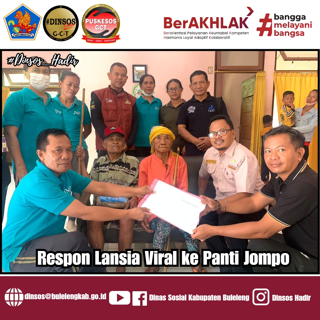 Pemerintah Daerah Kabupaten Buleleng melalui Dinas Sosial. memfasilitasi lansia viral di media sosial (medsos) ke Panti Jompo Tresna Werda Jara Mara Pati Desa Kaliasem, yang sebelumnya sudah dapat diassesmen tingkat kelayakan di rumahnya di Desa Pelapuan Kec.Busungbiu Buleleng
