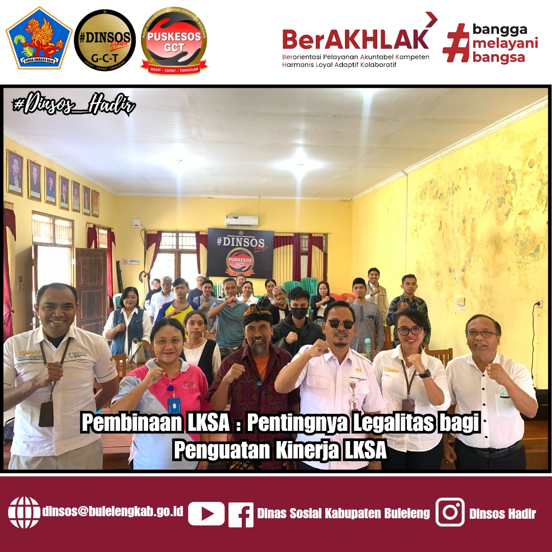 Bertempat di ruang rapat Dinas Sosial, Kadis Sosial Buleleng, Putu Kariaman Putra, bersama Kabid Dayasos Nyoman Mariani, melaksanakan pembinaan terhadap Lembaga Kesejahteraan Sosial Anak (LKSA) se-Kabupaten Buleleng. Kegiatan ini bertujuan untuk memperkuat sinergitas dan kolaborasi dalam menyelesaikan permasalahan sosial serta mendukung program kebijakan Pemerintah Daerah.