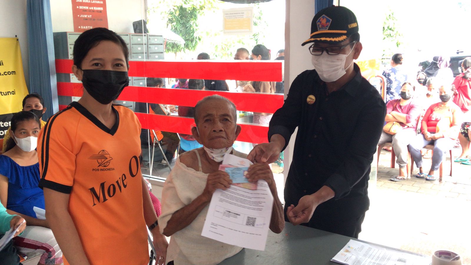 KADISSOS DAMPING KADIS DINSOS P3A PROV. BALIM ONEV PENYALURAN BANTUAN PROGRAM SEMBAKO SECARA TUNAI DI KANTOR POS TEMUKUS DAN KANTOR DESA BUSUNGBIU
