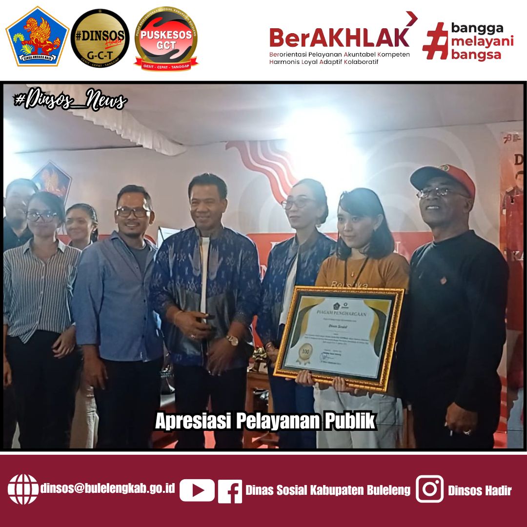 Dinas Sosial Kabupaten Buleleng pada diakhir penutupan Buleleng Devlopment Festival mendapatkan penghargaan Unit Pelayanan Publik dengan Kualitas Tertinggi dalam Penilaian Pelayanan Publik di Kabupaten Buleleng bekerjasama dengan Perwakilan Ombudsman RI Provinsi Bali pada tanggal 16 dan 19 Agustus 2024 dengan Perolehan Nilai 100
