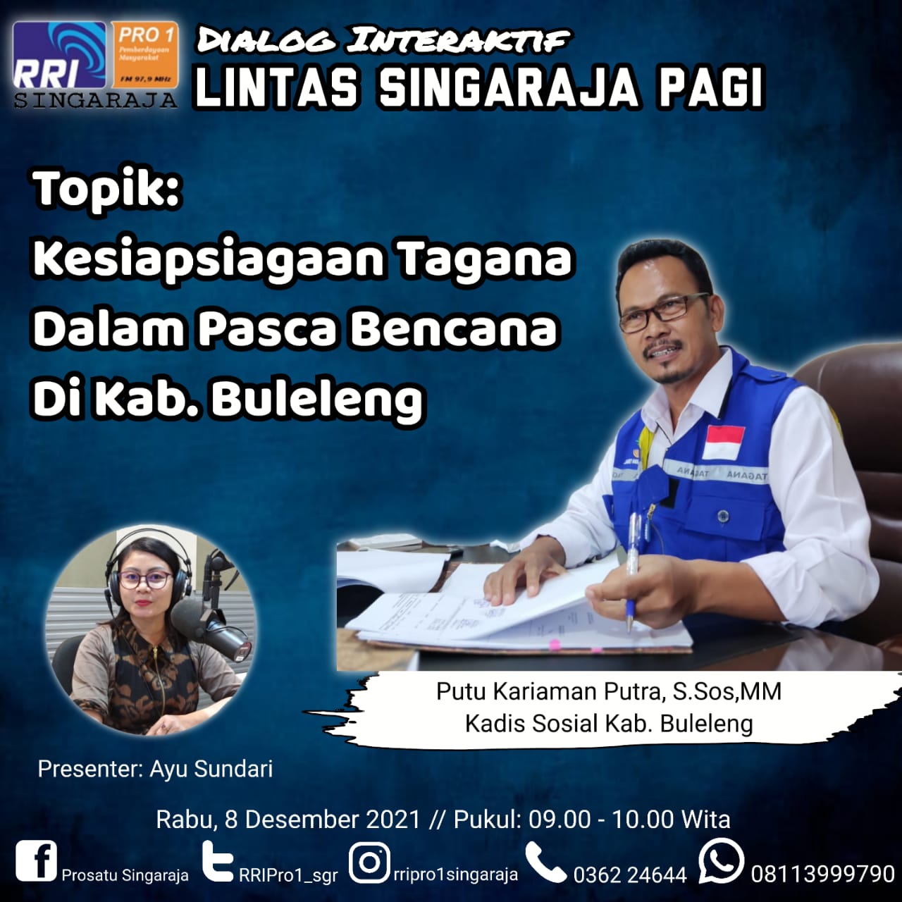 Kadis Sosial, I Putu Kariaman Putra,S.Sos,MM, menjadi narasumber dalam Dialog Interaktif Lintas Singaraja Pagi PRO 1 RRI Singaraja membahas topik tentang "Kesiapsiagaan Tagana Dalam Pasca Bencana di Kab. Buleleng". Tagana merupakan ujung tombak yang dimiliki oleh Dinas Sosial dalam menghadapi dan membantu masyarakat korban bencana baik bencana alam, bencana sosial, dan senantiasa hadir di tengah-tengah masyarakat bila terjadinya bencana. TAruna siaGA bencaNA dalam melaksanakan tupoksinya berupaya secara maksimal yang didalamnya sesuai dengan teknis prosedur yang ditetapkan.