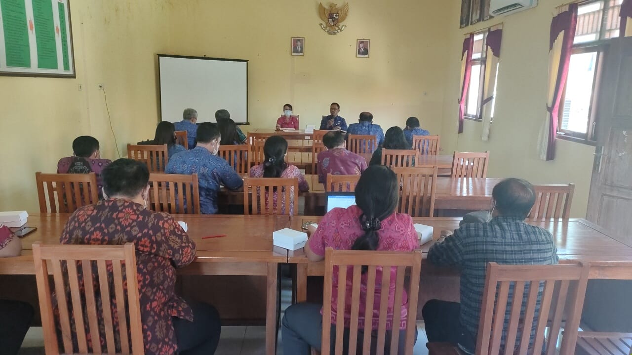 Kepala Dinas Sosial Buleleng I Putu Kariaman Putra,S.Sos,MM bersama Kabid Pemberdayaan Sosial dan Penanganan Fakir Miskin Nyoman Mariani Febrianti,S.Sos,M.A.P mengadakan Rapat penguatan program SLRT bersama OPD yang menjadi Back Office.