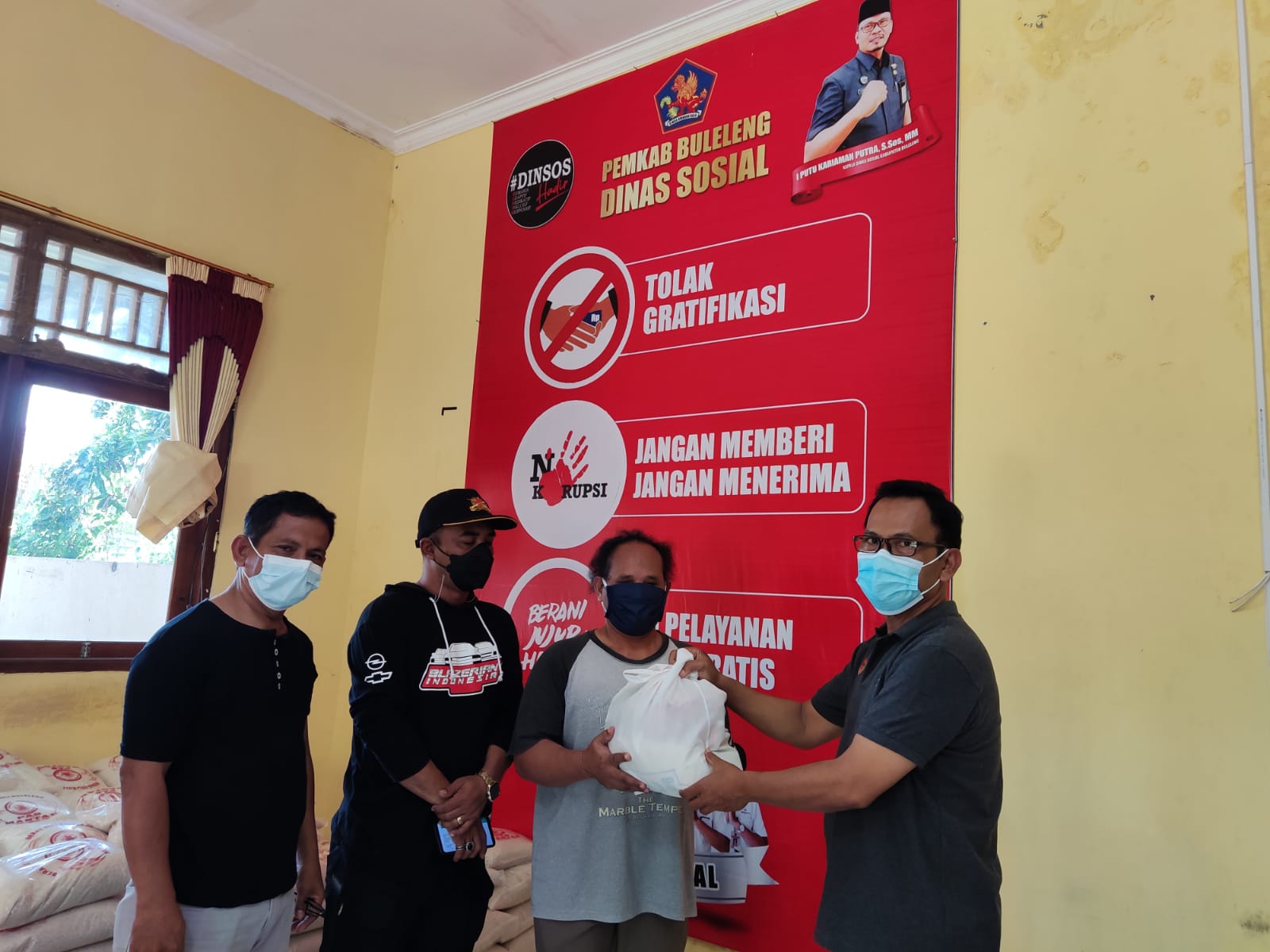 Penyaluran sembako dari asn se-Kabupaten Buleleng terus berlanjut, yang kali ini disalurkan untuk PERTUNI ( Persatuan Tuna Netra Indonesia ) dan GERKATIN ( Gerakan untuk Kesejahteraan Tunarungu Indonesia )Buleleng masing-masing 50 paket sembako. Lansia di Kecamatan Seririt 15 paket, serta Buruh di Desa Banjar Tegal 14 paket sembako. Total hari ini disalurkan sebanyak 129 paket sembako. I Putu Kariaman Putra,S.Sos,MM, selaku Kadis Sosial, langsung menyerahkan bantuan tersebut secara simbolis. Sembako tersebut berisikan berupa beras, telur, minyak, mie instan serta vitamin.