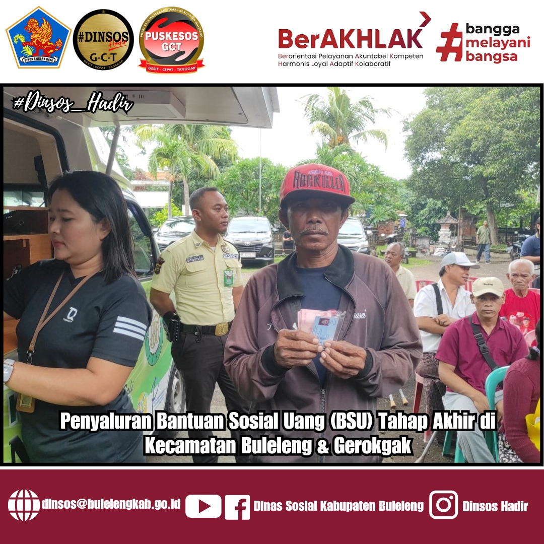 Dalam upaya mengentaskan kemiskinan Pemerintah Kabupaten Buleleng telah melaksanakan berbagai program dan kegiatan salah satunya melalui Dinas Sosial dengan mengucurkan program Bantuan Sosial Uang (BSU) yang bersumber dari APBD Buleleng untuk membantu Penyandang Disabilitas kurang mampu yang belum mendapatkan program bantuan sosial dan Masyarakat kategori kemiskinan ekstrem yang terdaftar dalam Data Terpadu Kesejahteraan Sosial (DTKS) Non Program.