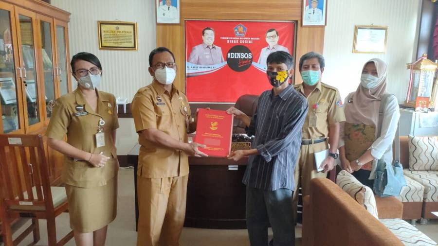 Kepala Dinas Sosial Kabupaten Buleleng I Putu Kariaman Putra,S.Sos,MM didampingi Kepala Bidang Pemberdayaan Sosial dan Penanganan Fakir Miskin Nyoman Mariani Febrianti,S.Sos, M.A.P, Kasi Pemberdayaan Sosial, Perorangan, Keluarga dan Kelembagaan Masyarakat Nyoman Sutama,SH menyerahkan Sertifikat Akreditasi untuk 6 LKSA di Kabupaten Buleleng.