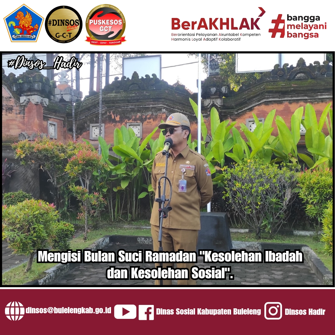 Kepala Dinas Sosial Kab.Buleleng I Putu Kariaman Putra,S.Sos,MM pada saat memimpin apel pagi mengucapkan selamat menunaikan ibadah puasa bagi seluruh umat muslim di Kabupaten Buleleng. Semoga ibadah puasa di Bulan Suci Ramadan 1446H ini, dapat dijalankan dengan penuh penuh kesabaran, keikhlasan, dan ketakwaan kepada Allah SWT Tuhan YME.