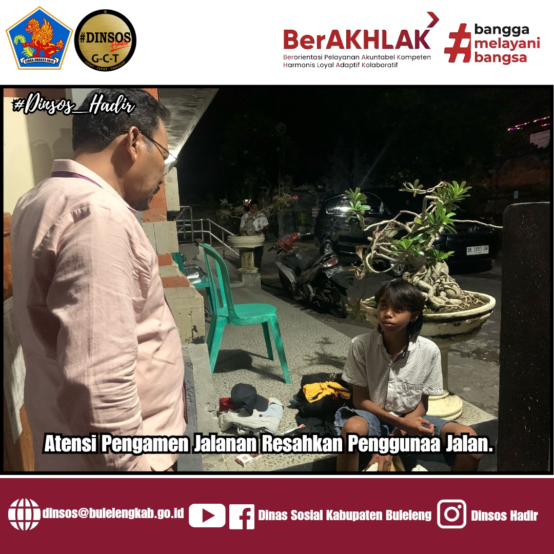 Guna menindaklanjuti keberadaan pengamen jalanan di sejumlah titik persimpangan kota singaraja yang semakin meresahkan warga terutama pengguna jalan. Menanggapi hal tersebut Kadis Sosial Buleleng, Kariaman Putra atensi langsung pengamanan anak pengamen jalanan yang hasil razia Satpolpp saat melancarkan aksinya mengamen di persimpangan Traffic Light Pantai Penimbangan Singaraja sekitar pukul 20.00 wita.