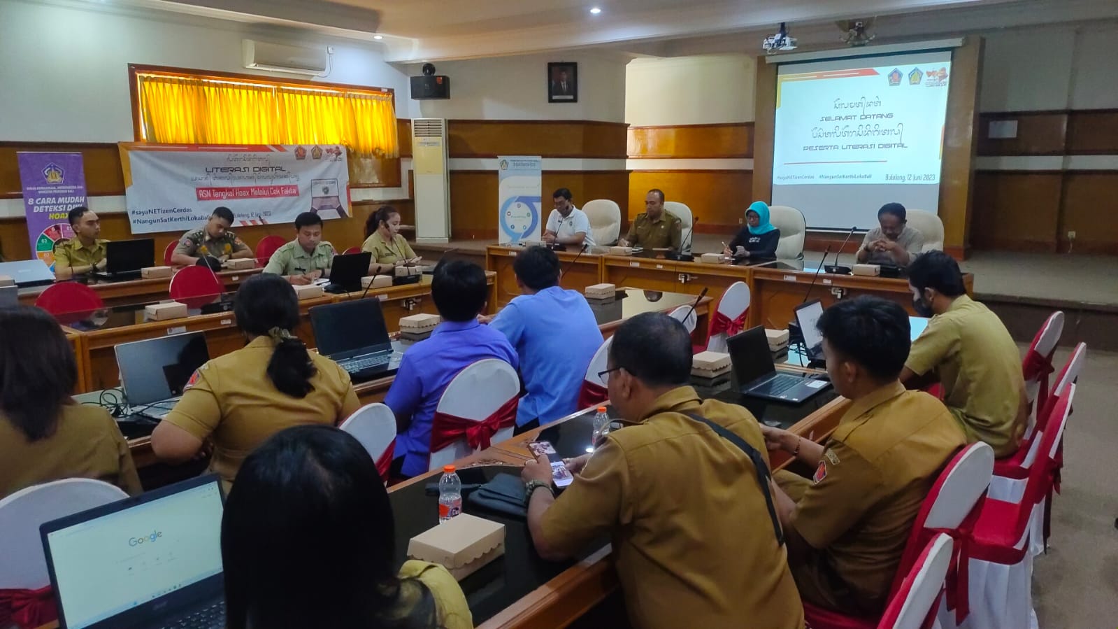 Turut hadir Kepala Bidang Persandian dan Statistik Buleleng, Wakil Ketua Penyiaran Indonesia Daerah Bali Drs.Ida Bagus Ketut Agung Ludra, Indria Trisni Puspita selaku koordinator Wilayah Bali (Mafindo Bali) sebagai narasumber dan seluruh operator Digital yang ada di masing-masing OPD Pemkab Buleleng. Tema kegiatan hari ini yakni ASN Tangkal Hoak melalui Cek Fakta.