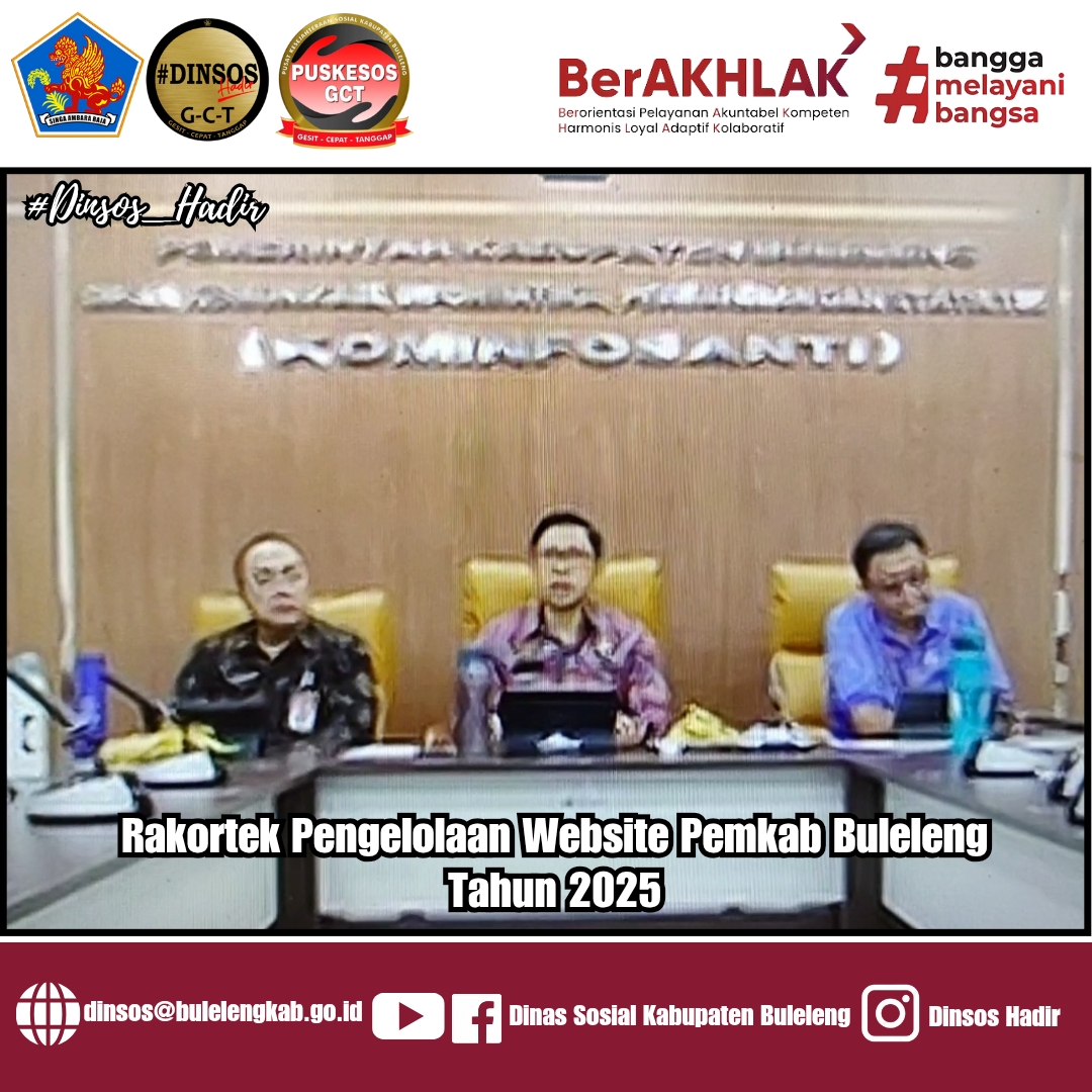 Dalam rangka optimalisasi pengelolaan Website Resmi Pemeritah Kabupaten Buleleng tahun 2025, Dinsos Buleleng mengikuti acara Rakortek Pengelolaan Website tahun 2025 via Zoom meeting, Dimana acara ini dipimpin langsung oleh Ketut Suwarmawan,SSTP,MM didampingi Ka.Bid.Tata Kelola dan Sumber Daya Manusia SPBE Ngakan Gde Dwi Dharma Yudha SE,M.A.P dan Ka.Bid.Persandian dan Statistik Komang Ery Marta Pariata,ST.