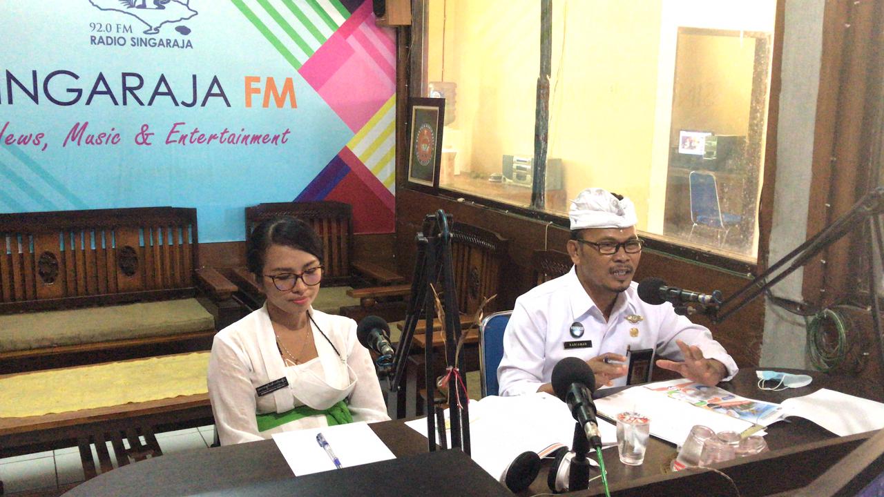 Kadis Sosial Buleleng I Putu Kariaman Putra,S.Sos, MM Bersama Kabid Pemberdayaan Sosial dan Fakir Miskin Nyoman Mariani Febrianti,S.Sos,M.A.P melaksanakan Interaktif di Singaraja 92.0 FM dengan tema “Penguatan SLRT Melalui Back Office bersama host I made darma”.