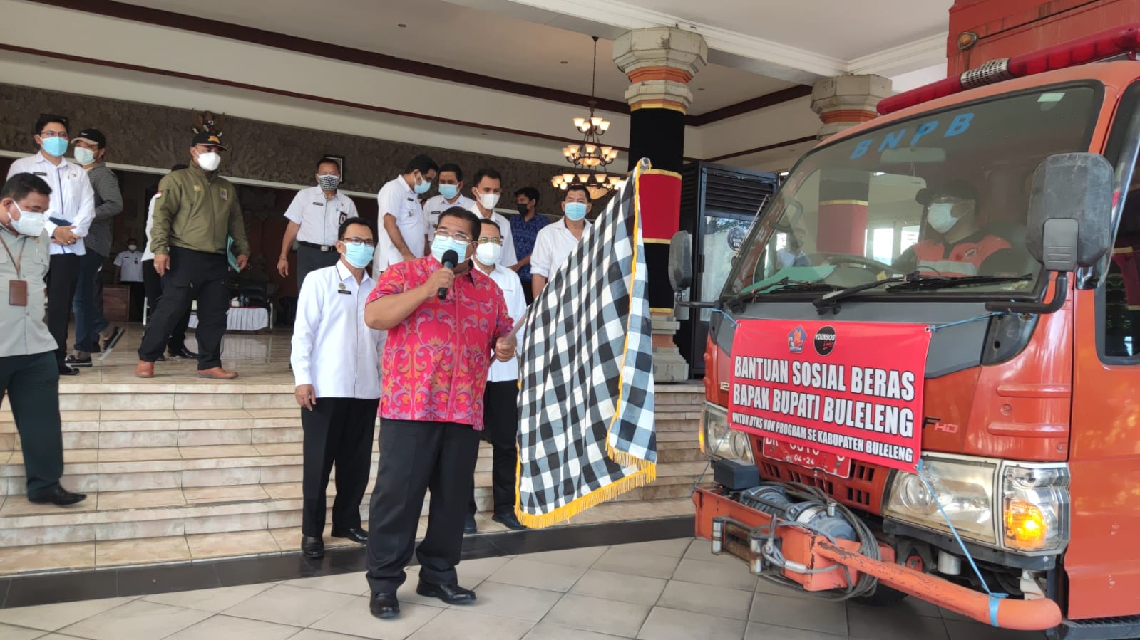 Kadis Sosial, I Putu Kariaman Putra,S.Sos,MM, yang juga menghadiri acara tersebut juga memberikan laporan sebelum sambutan Bapak Bupati Buleleng. Selain Kadissos, Asisten Pemerintahan, Kadis Kominfosanti, Kepala BPBD, serta para Camat juga hadir dalam acara penyerahan secara simbolis tersebut. 31 Ton beras yang hari ini disalurkan ke Kecamatan Sukasada, Kecamatan Buleleng, Kecamatan Tejakula dan Kecamatan Banjar. Sisanya dilanjutkan besok untuk pengiriman.