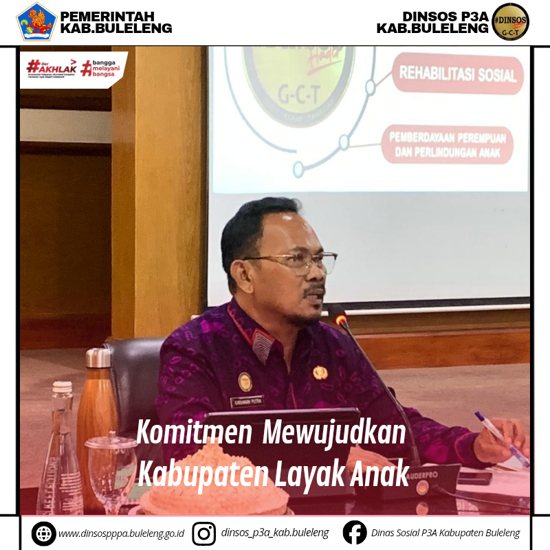 Kepala Dinas Sosial, Pemberdayaan Perempuan dan Perlindungan Anak (Dinsos P3A) Kabupaten Buleleng, I Putu Kariaman Putra,S.Sos.,MM bersama Ketua Forum PUSPA Provinsi Bali, Ny. Seniasih Giri Prasta dan Kepala Bidang PPM Bappeda Provinsi Bali menjadi narasumber dalam Sosialisasi Kabupaten/Kota Layak Anak (KLA) di Unit IV Setda Kabupaten Buleleng. Ketua Forum PUSPA Kabupaten Buleleng, Ny. Hermawati Supriatna turut mendampingi kegiatan ini serta diikuti oleh seluruh Gugus Tugas KLA Kabupaten Buleleng sebagai peserta sosialisasi.