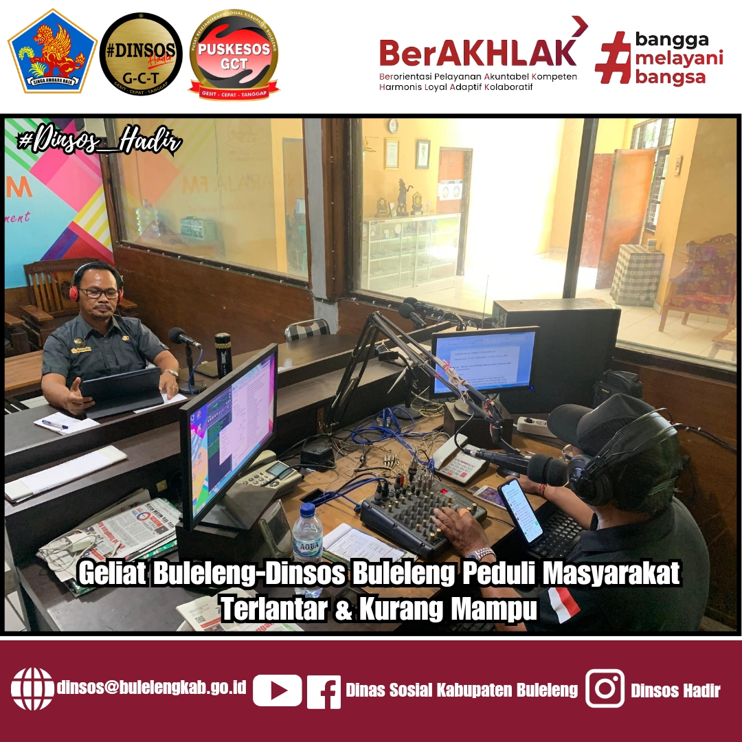 Kepala Dinas Sosial Kabupaten Buleleng, I Putu Kariaman Putra,S.Sos,MM menjadi narasumber di Radio Singaraja FM dalam program acara Talkshow Geliat Buleleng , bersama De Ama selaku host,Selasa(10/12/2024).