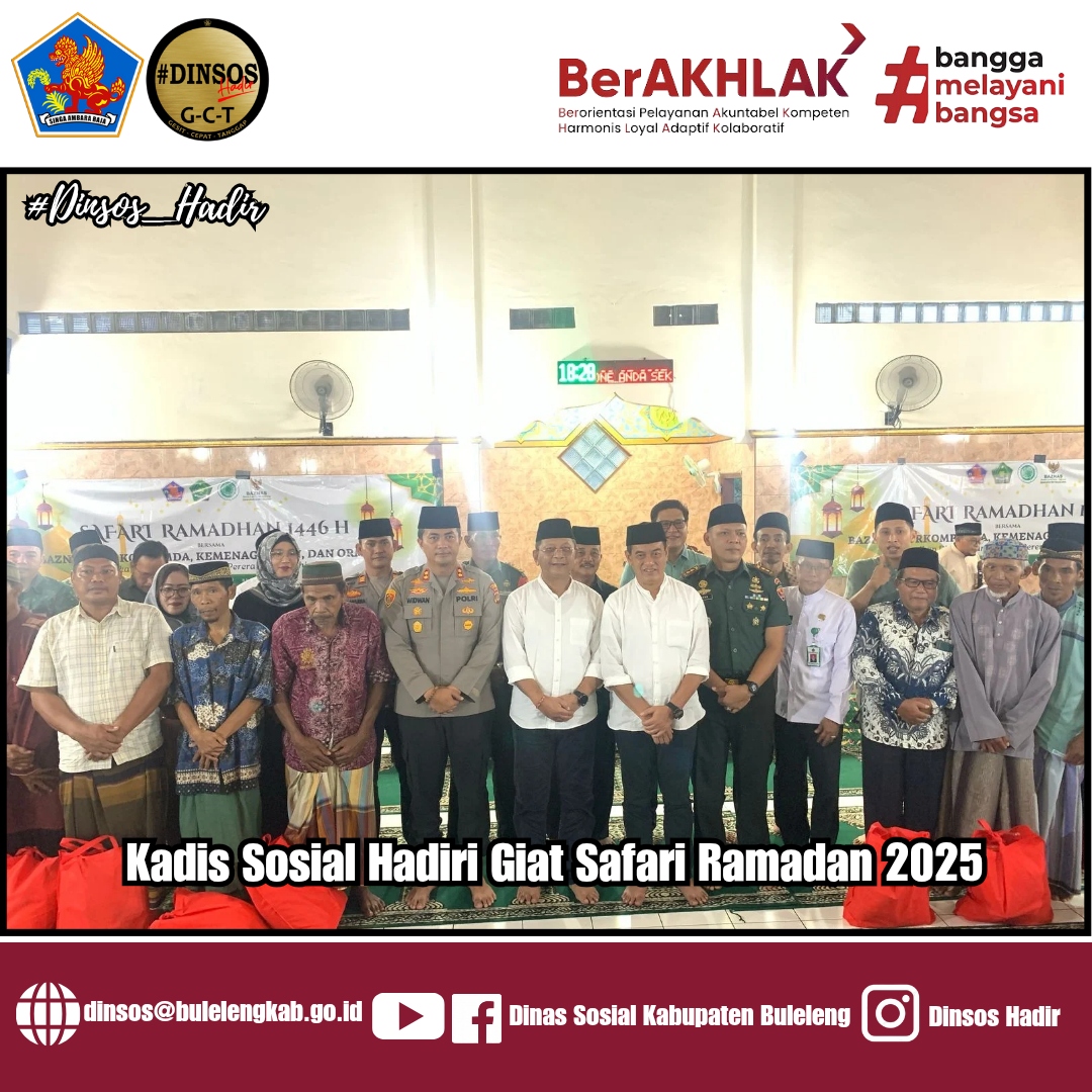 Kepala Dinas Sosial Kabupaten Buleleng , I Putu Kariaman Putra,S.Sos,MM, menghadiri kegiatan Safari Ramadhan 1446 H/2025 yang diselenggarakan oleh Badan Amil Zakat Nasional (Baznas), Forkompida, Kemenag, BUMN dan Ormas dengan mengusung tema kali ini yakni "Sucikan Diri Dengan Berbagi, Pererat Silahturrahmi" yang bertempat hari pertama di Masjid Al Ihsan Yehbau, Dusun Yehbau, Desa Tejakula, Kecamatan Tejakula, Kamis sore (06/03/2025).