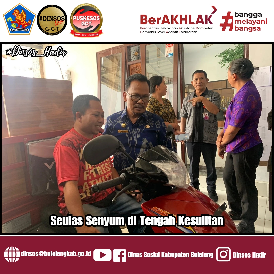Bergeser ke lokasi selanjutnya, Kadissos Kariaman Putra bersama Tim melanjutkan perjalanan menuju ke Kantor Desa Tamblang Kecamatan Kubutambahan guna melakukan kegiatan penyaluran bantuan sosial kewirahusaan berupa 1 paket sepeda motor roda tiga kepada keluarga penerima manfaat (KPM) atas nama Ketut Agus Suryawan berasal Banjar Dinas Kelampuak Desa Tamblang yang merupakan warga disabilitas fisik dengan kesehariannya bekerja sebagai pedagang kebutuhan dasar