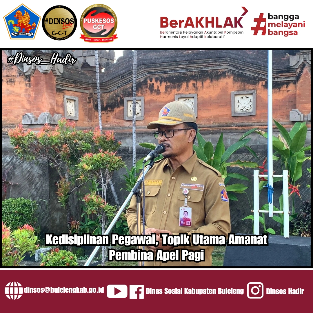 Apel pagi yang dipimpin oleh Kepala Dinas Sosial Kabupaten Buleleng, I Putu Kariaman Putra,S.Sos,MM, dalam amanatnya beliau menyampaikan beberapa hal penting yang menjadi fokus perhatian bersama dalam menjalankan tugas dan tanggung jawab bersama.