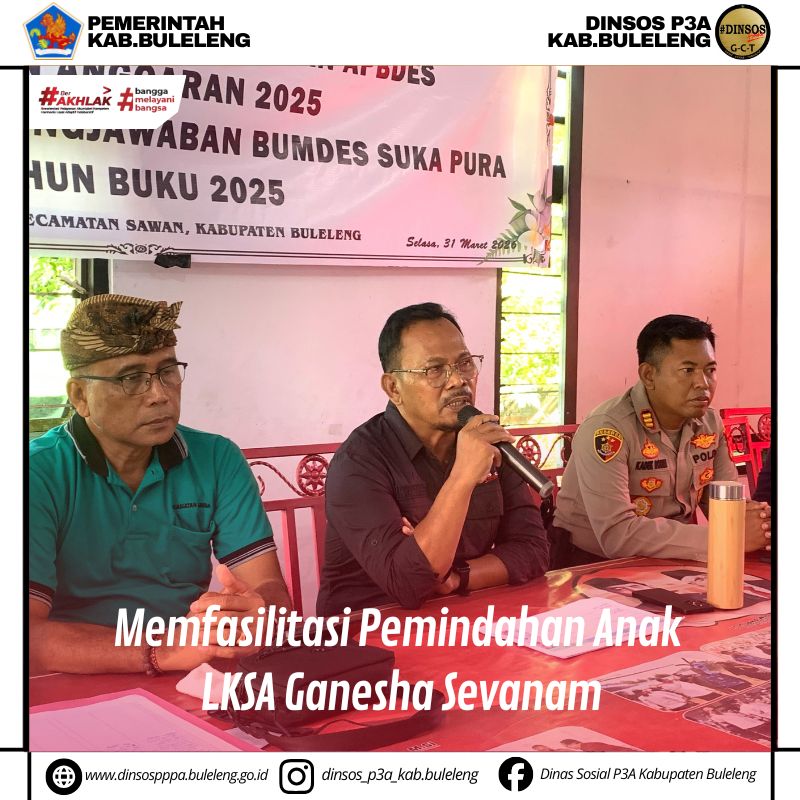 Pemerintah Kabupaten Buleleng melalui Dinas Sosial, Pemberdayaan Perempuan dan Perlindungan Anak (Dinsos P3A) Kabupaten Buleleng melaksanakan kegiatan pemindahan anak-anak panti asuhan dari Panti Asuhan Ganesha Sevanam yang berlokasi di Desa Jagaraga, Kecamatan Sawan, pada Minggu (5/4/2026).