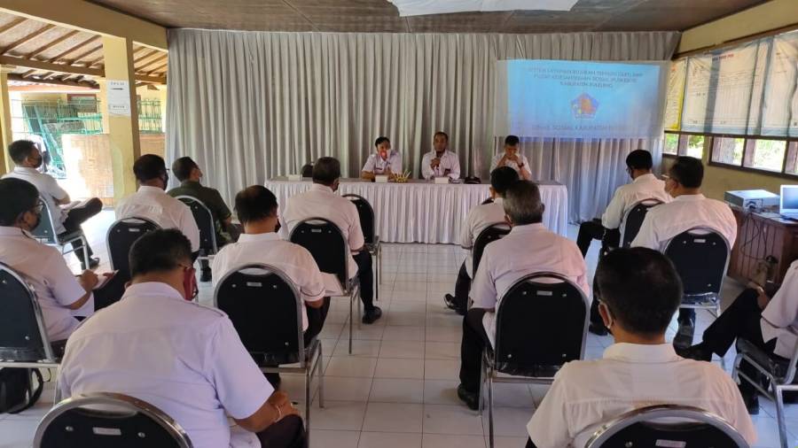 Singaraja, 14 Oktober 2020, Kepala Dinas Sosial I Putu Kariaman Putra,S.Sos,MM dalam hal ini diwakili oleh Sekretaris Dinsos Buleleng Putu Gopi Suparnaca,S.Sos didampingi Kabid Perlindungan Jaminan Sosial, Yayan Sutrisna, S.Sos, melaksanakan kegiatan sosialisasi pembentukan PUSKESSOS (Pusat Kesejahteraan Sosial) dan SLRT (Sistem Layanan Rujukan Terpadu) di Ruang rapat Kantor Lurah Liligundi.