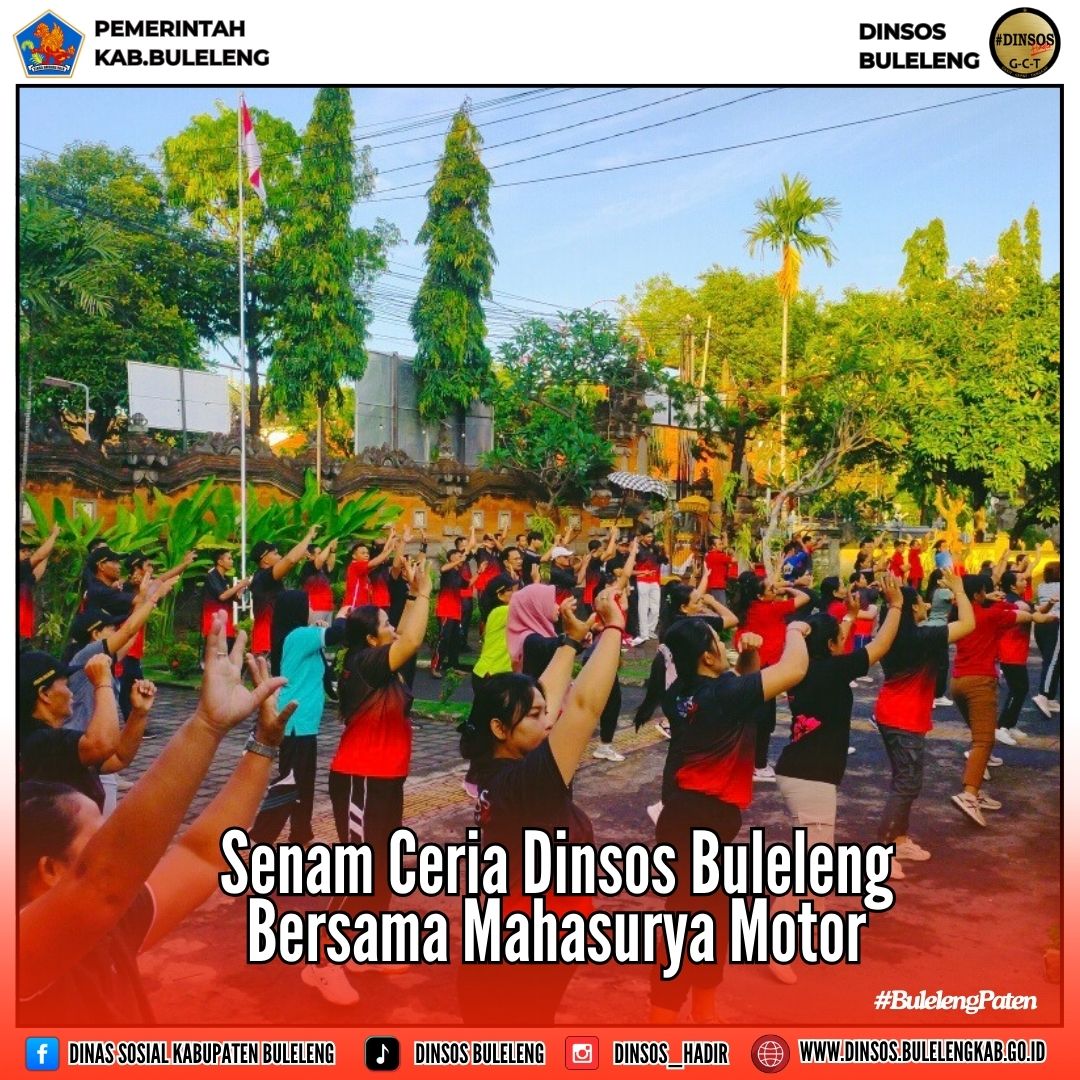 Suasana penuh semangat dan keceriaan menyelimuti suasana pagi hari di halaman depan Dinsos Buleleng. kegiatan Senam Ceria yang diselenggarakan oleh Dinas Sosial Kabupaten Buleleng bekerja sama dengan Mahasurya Motor ini diikuti oleh seluruh SDM Dinsos, mulai dari pejabat struktural, ASN, PPPK sampai dengan SDM yang ada di monument.