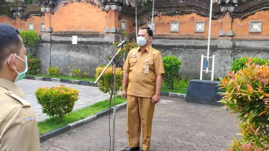 Kadis Sosial I Putu Kariaman Putra,S.Sos,MM memimpin langsung Apel pagi di awal Bulan Nopember 2020 dengan dihadiri oleh seluruh pegawai Dinsos Buleleng di halaman depan Dinsos Buleleng.