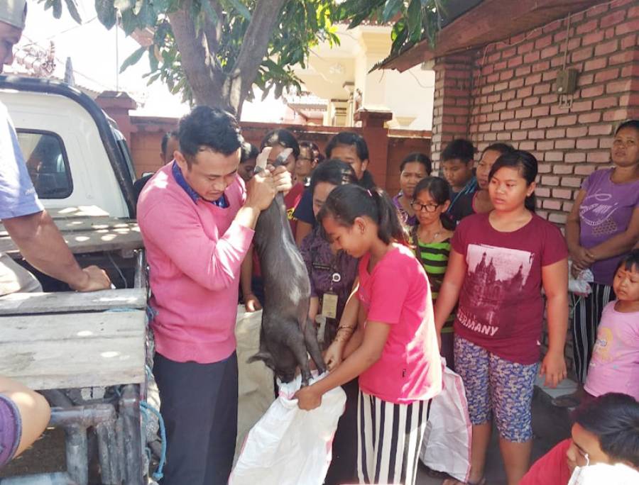 Dinas Sosial Kabupaten Buleleng mengadakan kegiatan penyerahan bantuan bibit ternak babi untuk anak-anak putus sekolah yang dianggap kurang mampu di Desa Sangsit, Kecamatan Sawan, Kabupaten Buleleng.