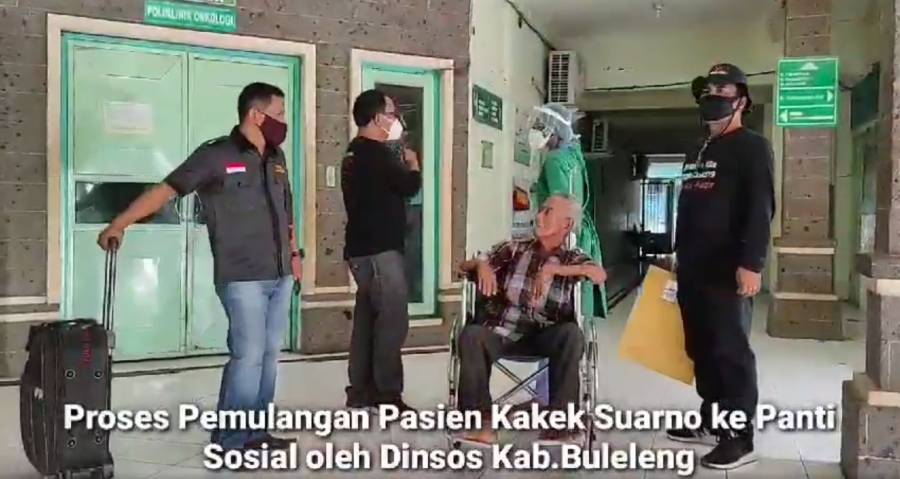 Singaraja, 16 Oktober 2020, Kepala Dinas Sosial I Putu Kariaman Putra,S.Sos,MM didampingi oleh Sekdis Sosial Kabupaten Buleleng Putu Gopi Suparnaca,S.Sos dan Kasi Rehabilitasi Sosial dan Penyandang disabilitas Maman Wahyudi melakukan penjemputan pasien yang bernama Suarno 84 tahun asal Desa Cipinang, Kecamatan Pulo gadung Kota Jakarta Timur, yang ditemukan 3 hari lalu di Kelurahan Seririt dengan keadaan lemas tak berdaya dikarenakan beberapa hari tidak makan dan minum, hari ini Kakek Suarno keadaannya sudah sehat kembali dan Dinas Sosial Kabupaten Buleleng bersinergi dengan Pihak Panti Sosial Tresna Werdha "Jara Mara Pati" Desa Kaliasem, Kecamatan Banjar, Kabupaten Buleleng dan Kakek Suarno untuk sementara di titipkan di Panti Sosial guna mendapatkan perhatian dan perawatan sebelum dipertemukan dengan sanak keluarganya yang berada di Cipinang Jakarta Timur.