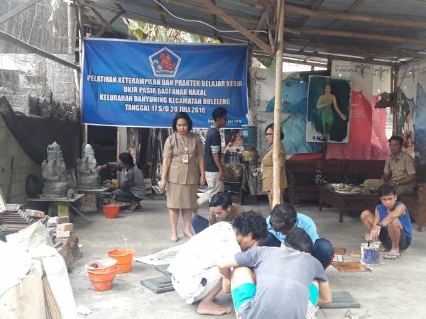 Selasa (28/08) Pemerintah Kabupaten Buleleng melalui Instansi Dinas Sosial Kabupaten Buleleng turun langsung ke Kelurahan Banyuning guna mengadakan monev kegiatan pelatihan keterampilan dan praktek belajar kerja ukir pasir bagi Anak Nakal.