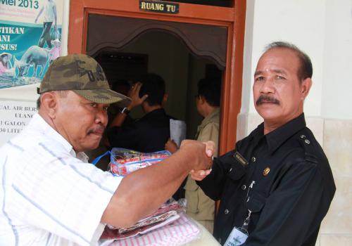 Penyerahan beras langsung Kepala Dinas Sosial Kabupaten Buleleng beserta Team Penanggulangan Bencana Sosial Dinas Sosial Kabupaten Buleleng langsung kepada korban disaksikan oleh Perangkat Desa dalam hal ini Perbekel Desa, Kaur Kesra dan Staff Desa.