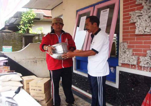 Penyerahan beras langsung kepada masyarakat yang terkena musibah dimana disaksikan oleh perangkat Desa Pakisan,Perbekel Desa Pakisan dan Kepala Seksi Perlindungan Sosial beserta staff pegawai Dinas Sosial Kabupaten Buleleng.